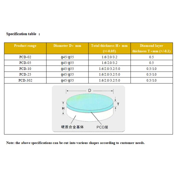 My company's production of PCD composite sheet using high-quality Diamond powder as raw material, the use of a unique process, the diamond powder and carbide matrix sintering at high temperature and pressure, Diamond Layer and carbide layer is firmly bonded, Diamond particles was D-D bond between the connection.Our company produced PCD composite sheet Diamond content of more than 90%, both with high hardness and wear resistance, but also has good impact toughness, is to achieve the ideal composite superhard material to automotive grinding, high efficiency and low cost cutting.Widely used in the processing of copper, aluminum and other non-ferrous metals and various types of alloy materials, wood, laminate flooring, graphite, rubber, Plastics, Ceramics, refractories and other high hardness and difficult processing of composite materials, can also be used in the manufacture of testing equipment and other equipment support, guide wear parts.And according to user needs, the product processing into a square, triangular, fan-shaped and other shapes.